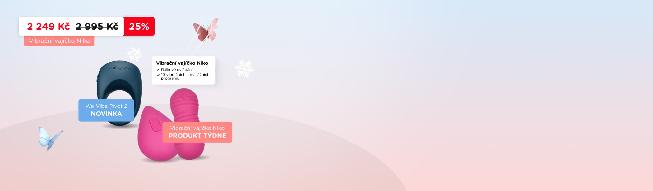 Máme pro vás skvělou novinku a produkt týdne se slevou 25%: Vibrační vajíčko Niko pro párové hrátky s dálkovým ovládáním! Plus super novinka: Vibrační kroužek Pivot 2, pro sdílené potěšení a společný orgasmus.